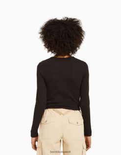 Bershka للجنسين تي شيرت مضلع طويل الأكمام أسود 804X3863 ملابس