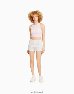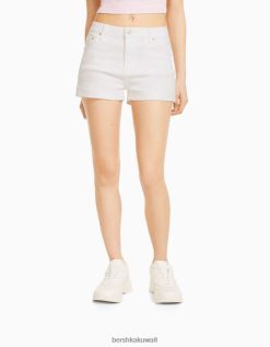 Bershka للجنسين شورت تويل مريح مع حواف مطوية أبيض 804X4027 ملابس