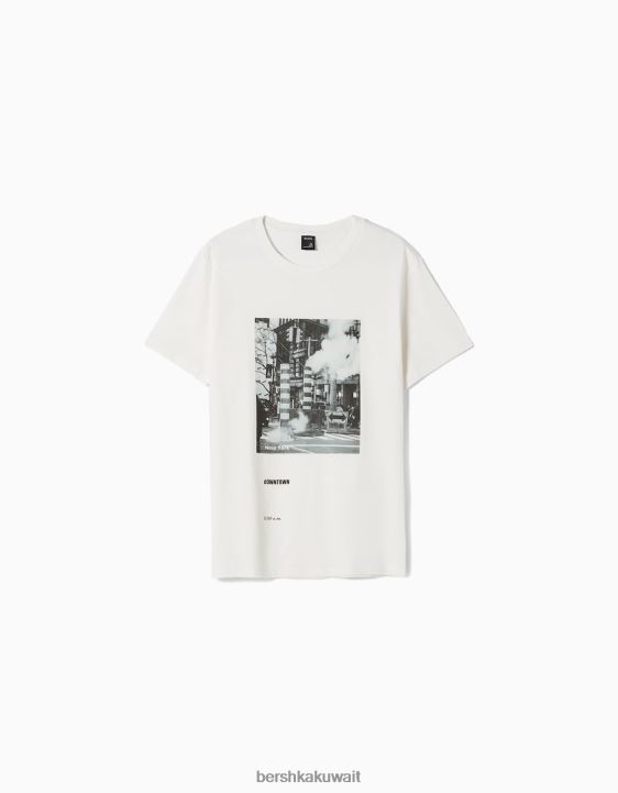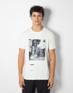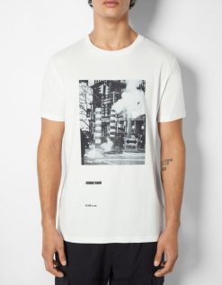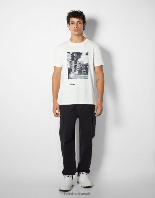 Bershka رجال تي شيرت مطبوع بأكمام قصيرة من البيض 804X2674 ملابس