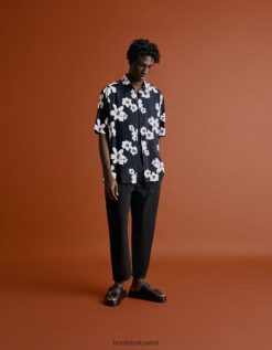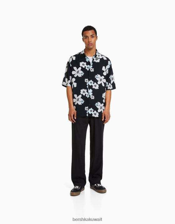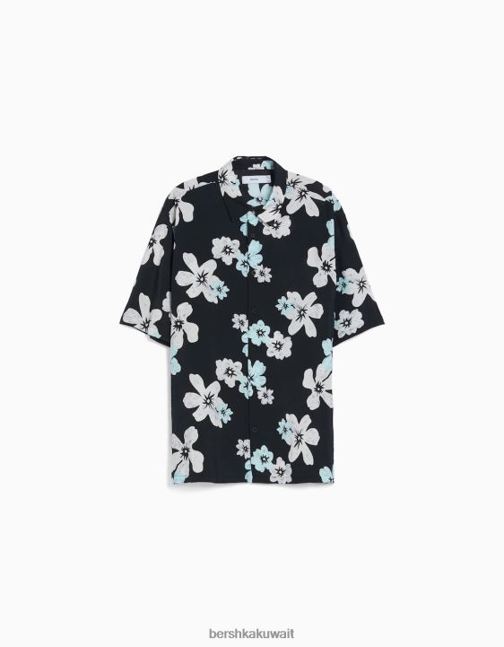 Bershka رجال قميص بأكمام قصيرة وطبعة زهور أسود 804X2891 ملابس