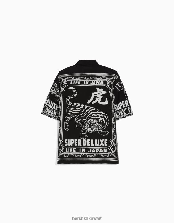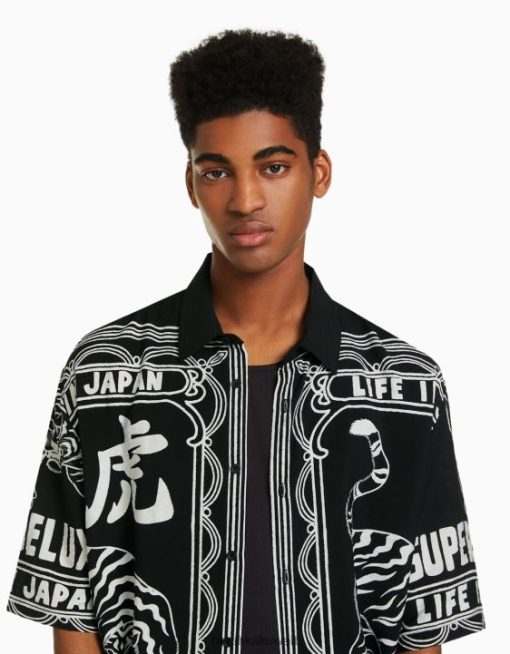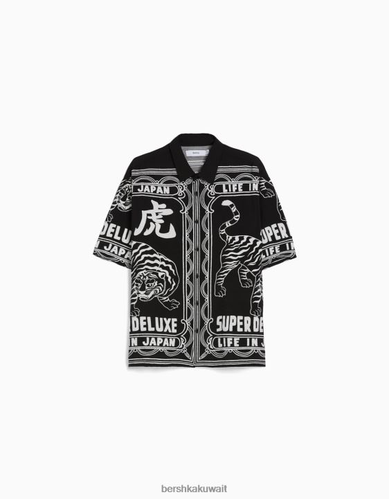 Bershka رجال قميص مطبوع بأكمام قصيرة أسود 804X2860 ملابس