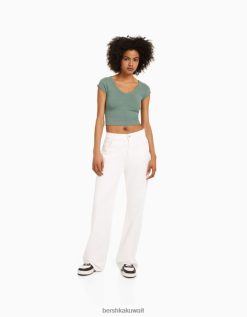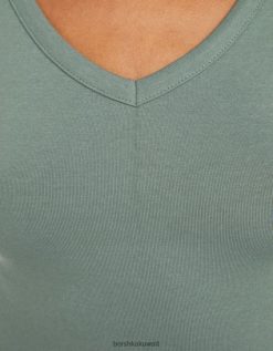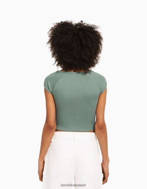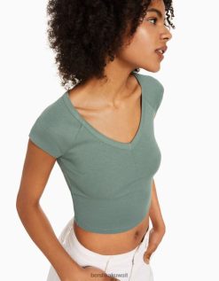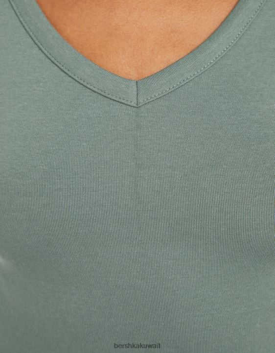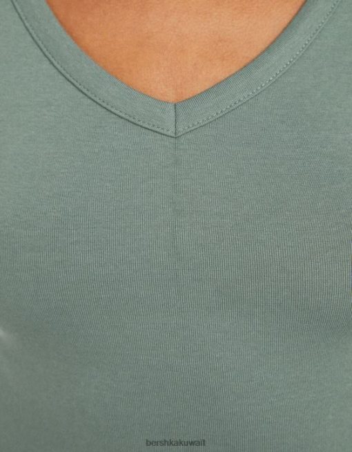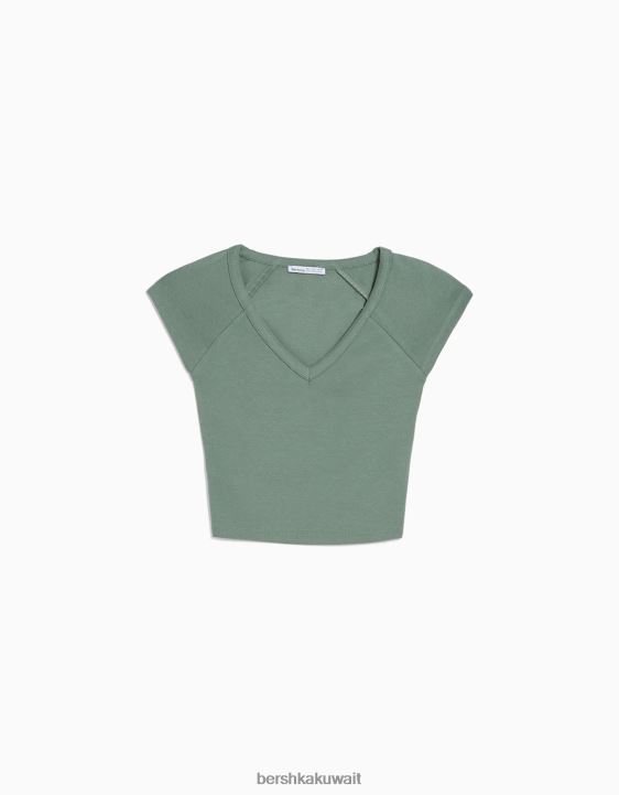 Bershka للجنسين تي شيرت ضيق بأكمام ريجلان بياقة على شكل V الكاكي 804X3814 ملابس