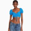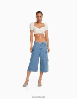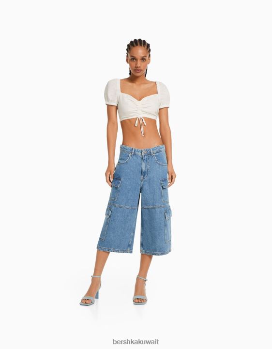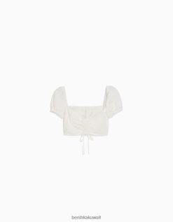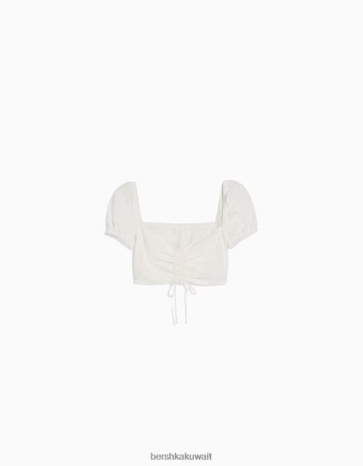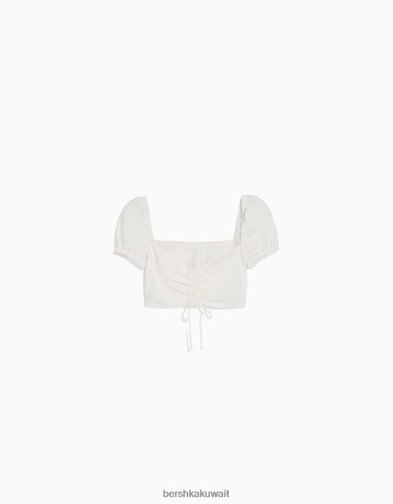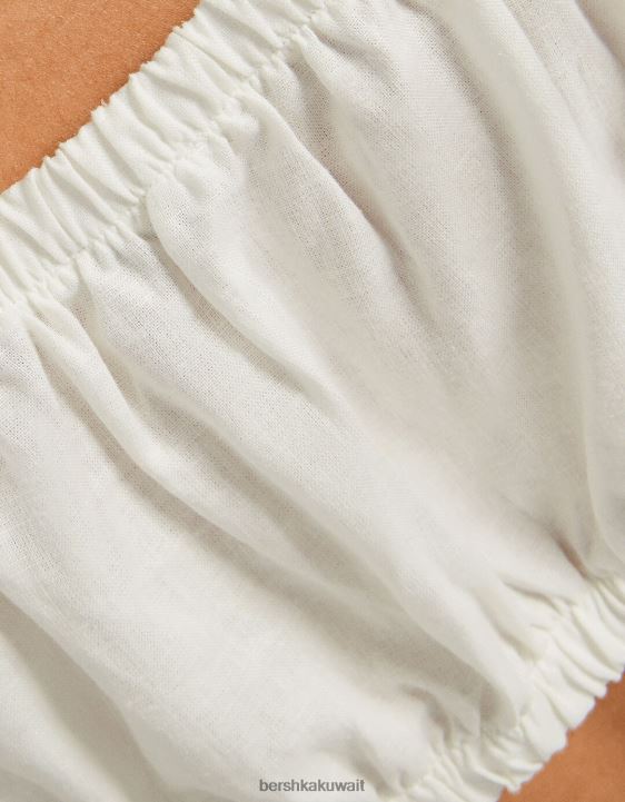 Bershka نحيف توب قصير الأكمام من مزيج الكتان بتفاصيل مجمعة أبيض 804X772 ملابس