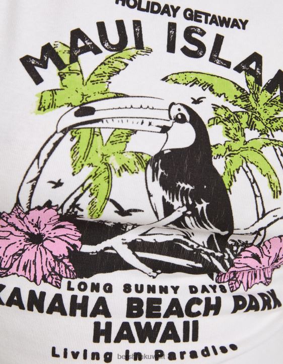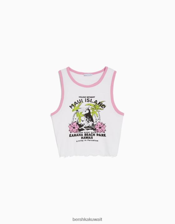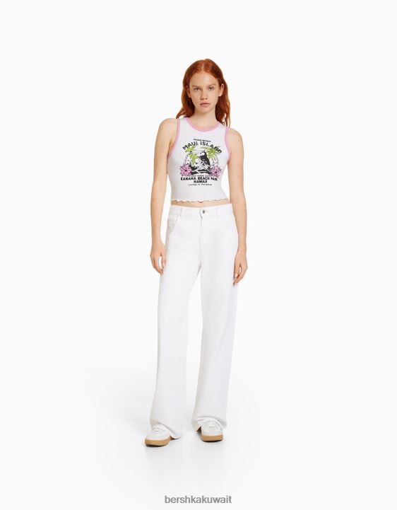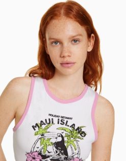 Bershka نحيف تي شيرت قصير مطبوع بلا أكمام أبيض 804X295 ملابس