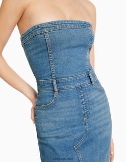 Bershka نحيف فستان طويل من الدنيم أزرق فاتح 804X1962 ملابس